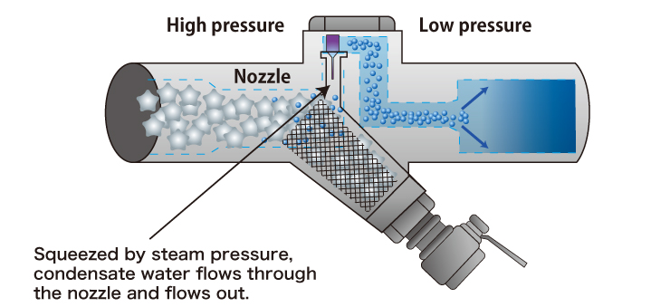 The role of a steam trap is to separate condensate water, which is created inside, from steam and quickly exhaust it to maximize and maintain the performance of the apparatus.
